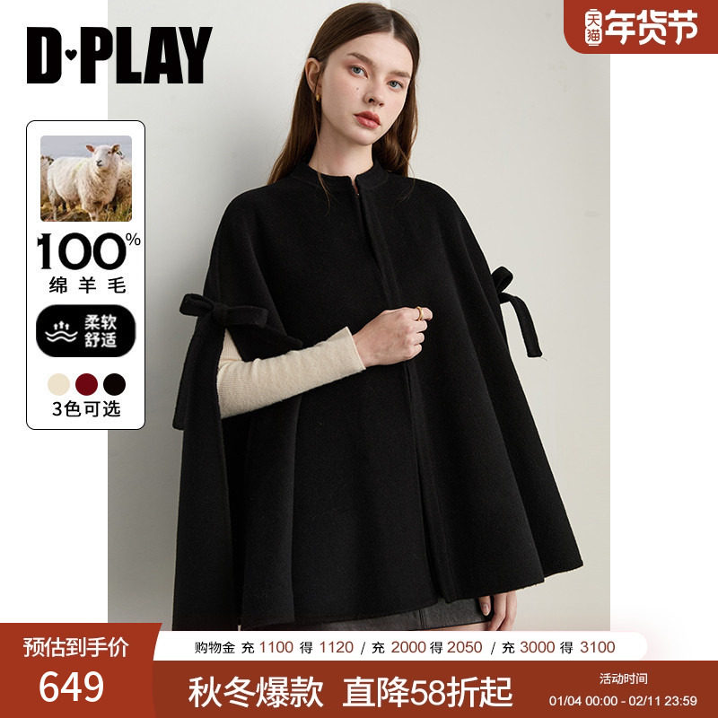 DPLAY2025年冬季新款黑色外套女斗篷100羊毛双面呢子蝴蝶结大衣