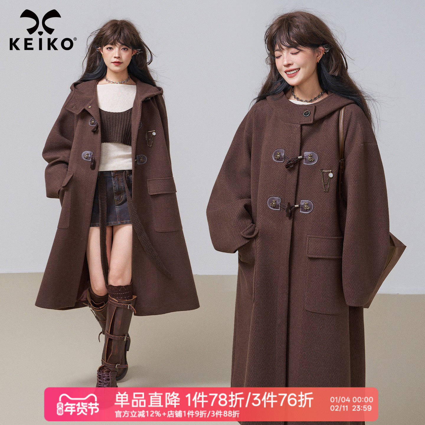 KEIKO 复古牛角扣斗篷型毛呢大衣秋冬学院风中长款连帽呢子外套