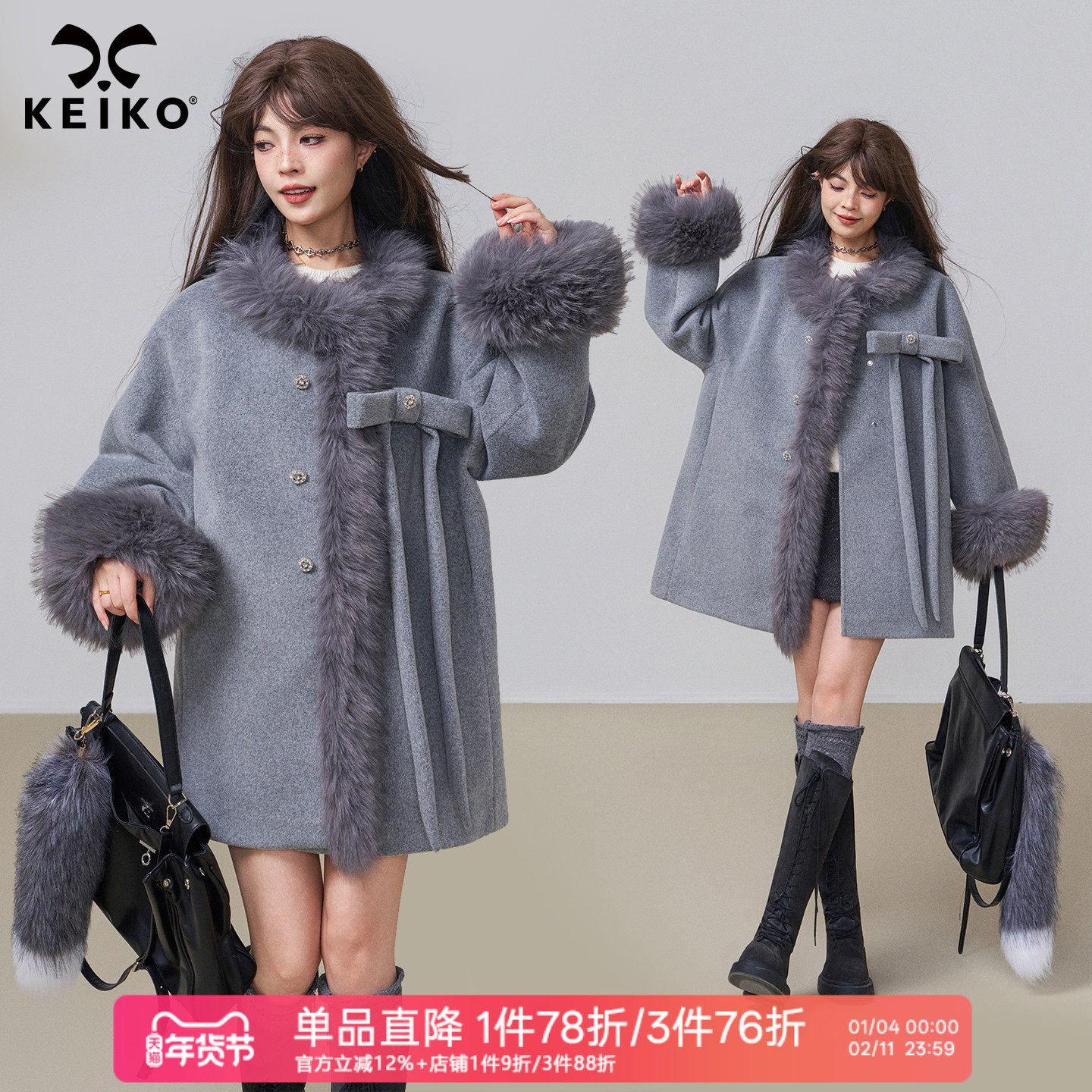 KEIKO 千金感毛绒拼接羊毛呢大衣25冬季静奢风斗篷型显瘦呢子外套