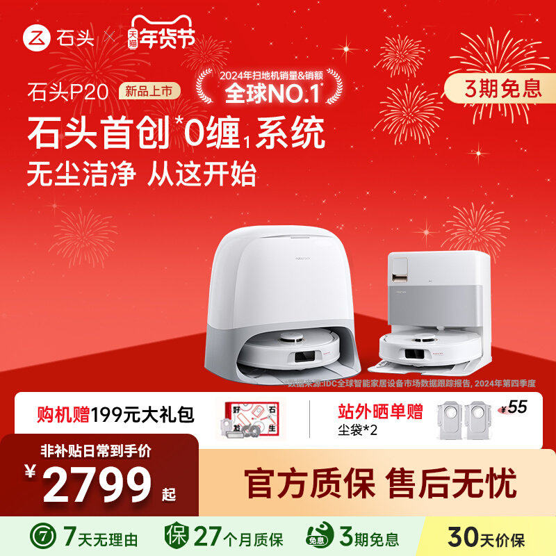 【官方正品】石头扫地机器人P20自清洁扫拖地全自动上下水一体