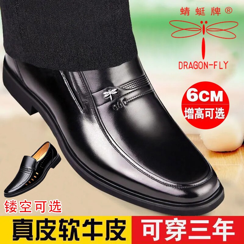真皮牛皮蜻蜓牌男鞋商务正装爸爸真皮鞋内增高休闲软底耐磨鞋黑色