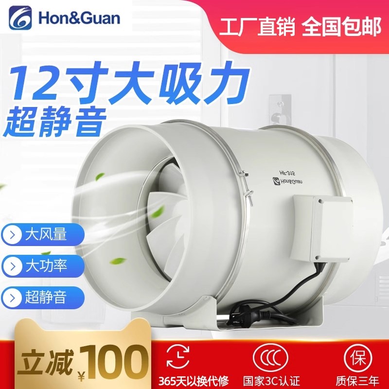 鸿冠超静音管道风机家用换气扇厨排气扇房排烟所卫生间抽风机卧室