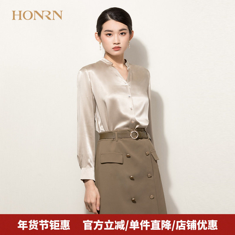 HONRN/红人气质长袖v领显瘦桑蚕丝真丝衬衫女上衣春秋款HH11OC610