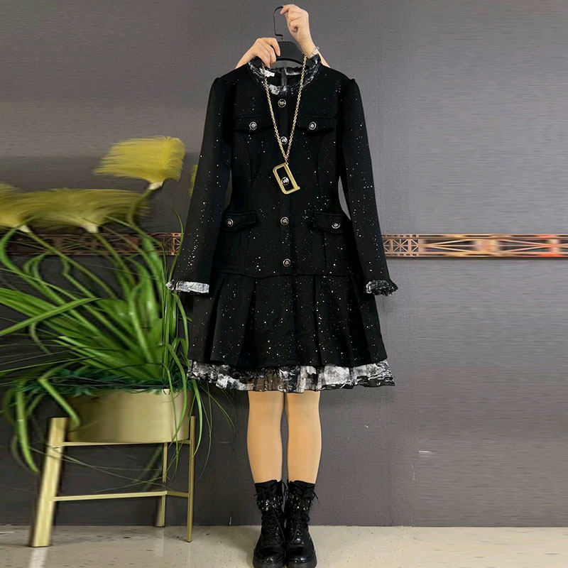 春季新款胖mm大码女装韩版时尚亮片撞色拼接假两件设计感连衣裙女
