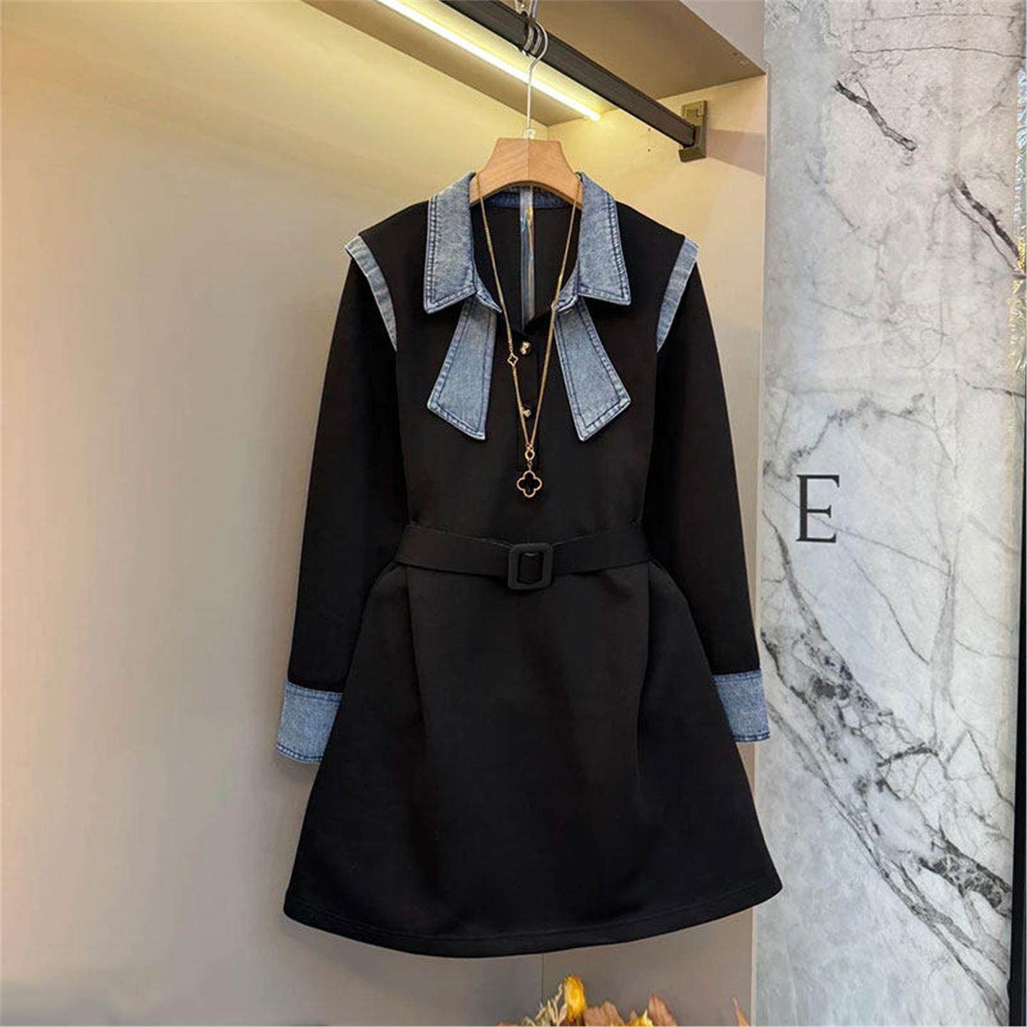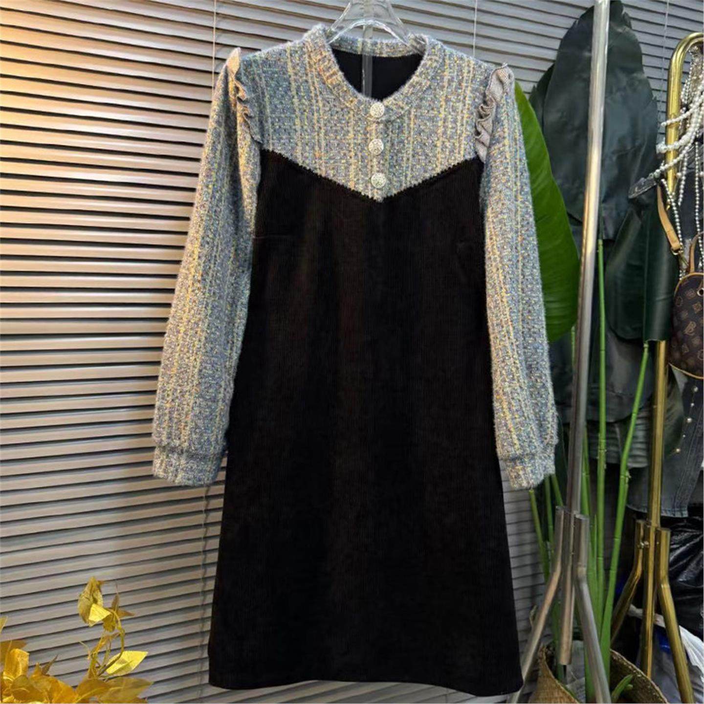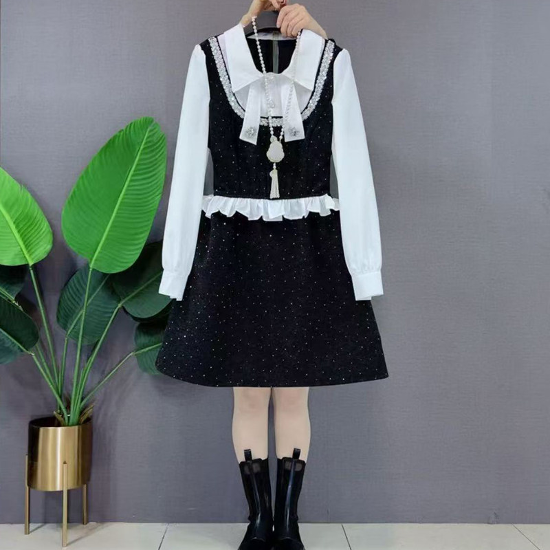 两件大码香风女装新品春季韩版拼接时尚连衣裙圆领小黑裙小拼色假