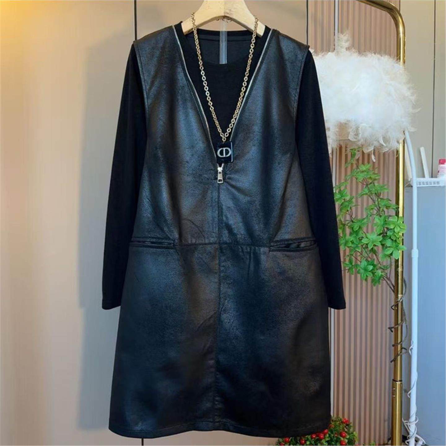大码女装春季新款时尚连衣裙韩版V领拼接假两件长袖显瘦背心裙潮