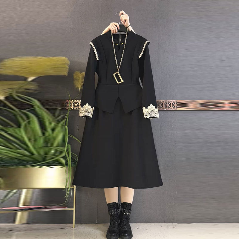 大码女装春季新款法式千金风黑色长袖连衣裙女韩版显瘦通勤A字裙