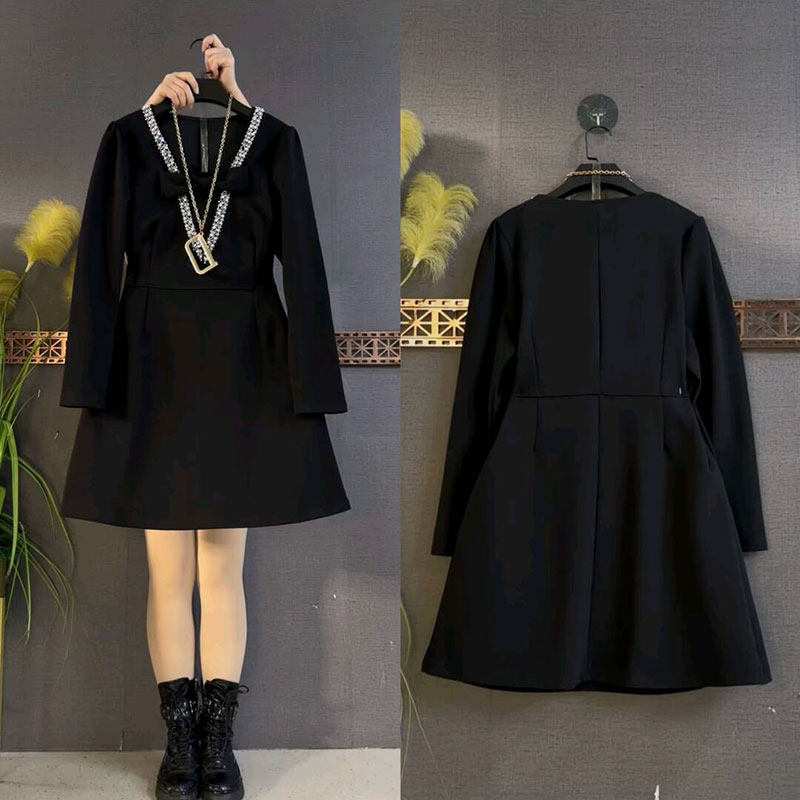 2026春季新款韩版时尚亮钻蝴蝶结连衣裙大码女装胖mm收腰显瘦黑裙