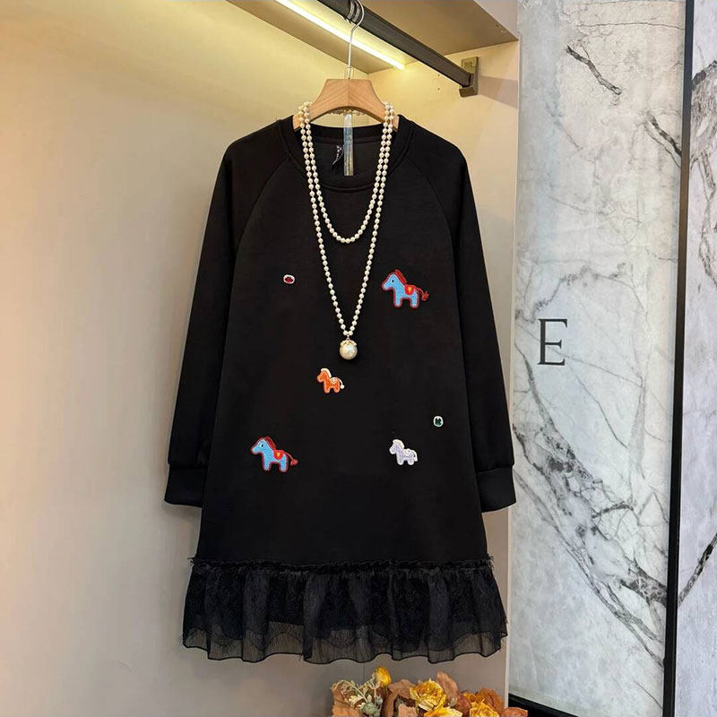 2026春季新款胖mm大码女装韩版时尚休闲小马蕾丝边洋气卫衣连衣裙