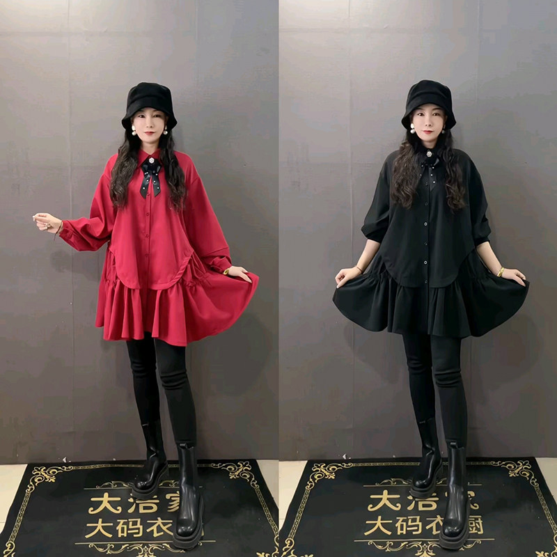 胖妹妹大码女装春季新款韩版时尚宽松蝴蝶结衬衫领设计大码连衣裙