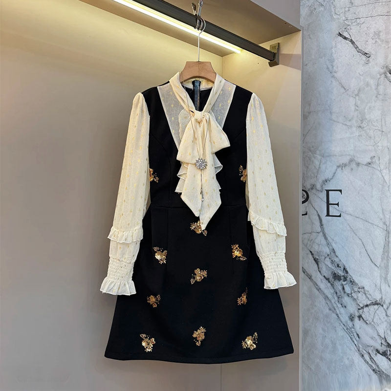 复古2026春季新款时尚长袖韩版显瘦假两件连衣裙气质收腰短裙时尚