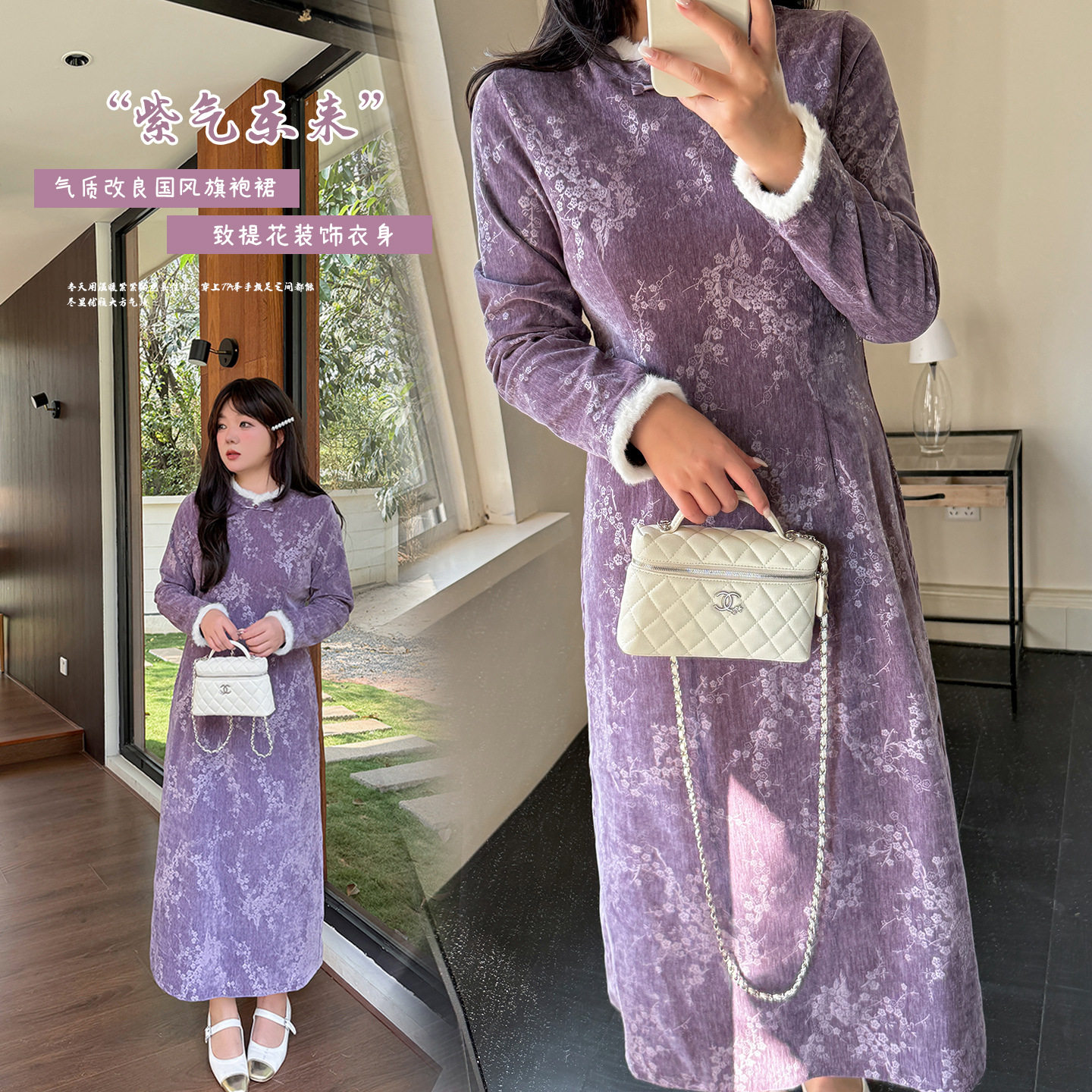 大码韩版气质提花淑女紫色旗袍2026年春季新款保暖新中式连衣裙潮