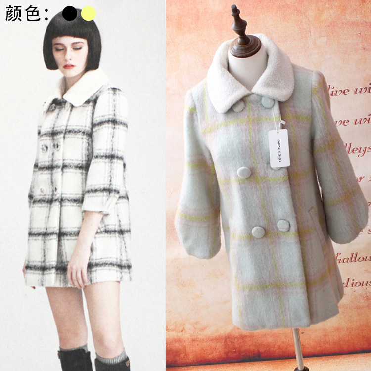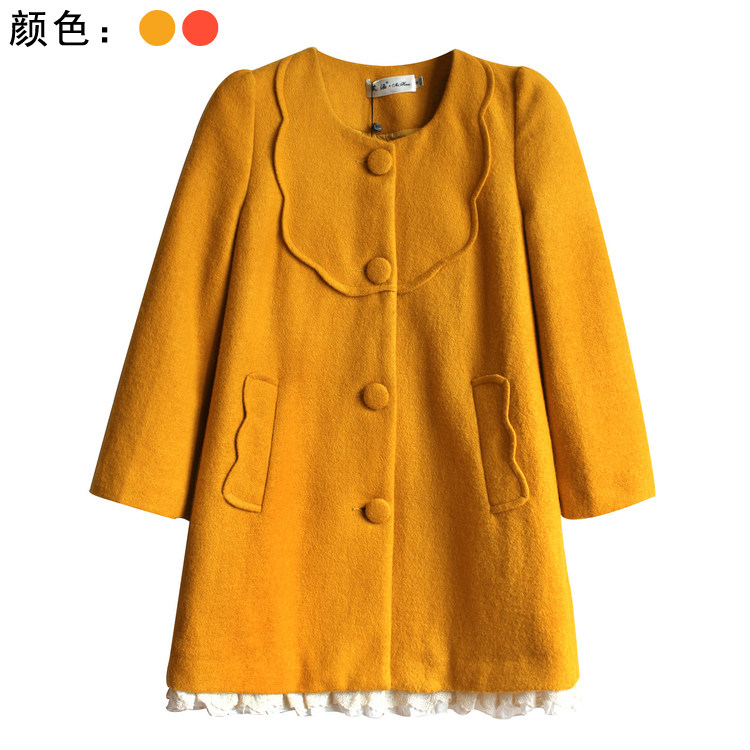 国内撤柜 2014秋冬甜美波浪边宽松娃娃A字版羊毛呢料大衣长外套特