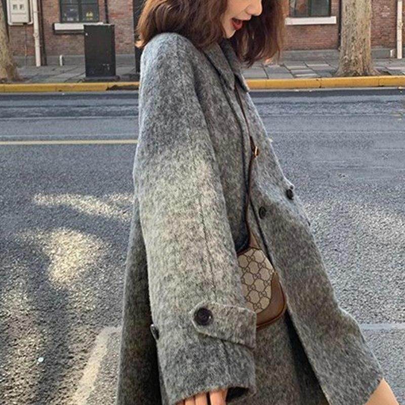 悦空间超长款毛呢大衣女宽松版型西装领A字双排扣秋冬外套气质灰