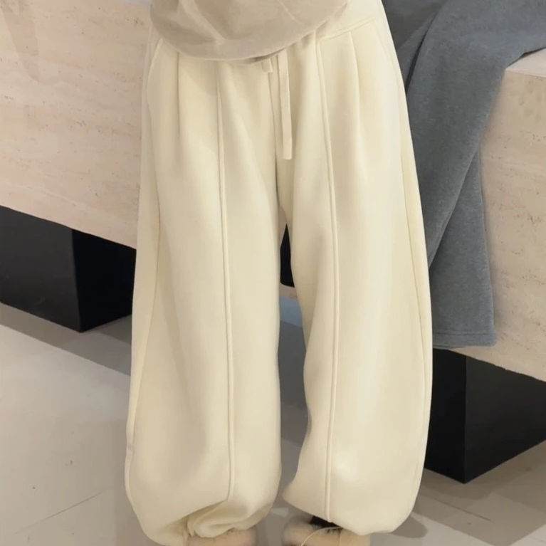 NEVA HU灰色休闲加绒卫裤阔腿裤女松紧腰抽绳裤子宽松拖地长裤