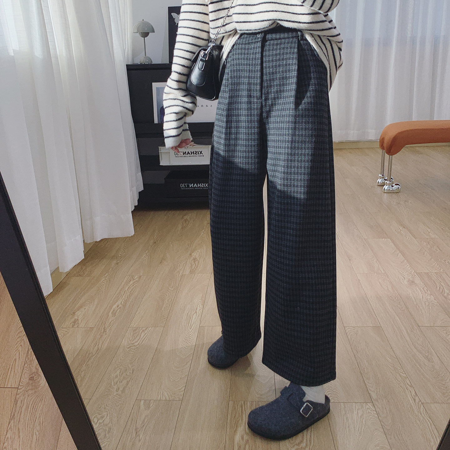 毛呢条纹阔腿裤女加绒秋冬新款宽松深灰色松紧腰休闲直筒条纹裤子
