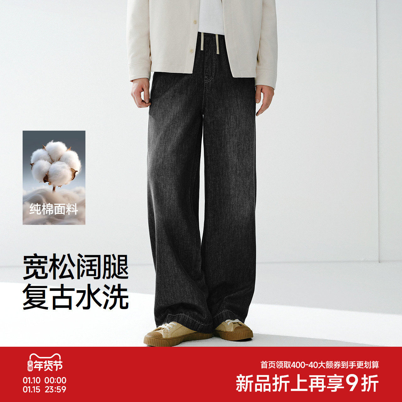 森马牛仔裤男款宽松阔腿牛仔裤基础百搭长裤2026春新款松紧腰裤子