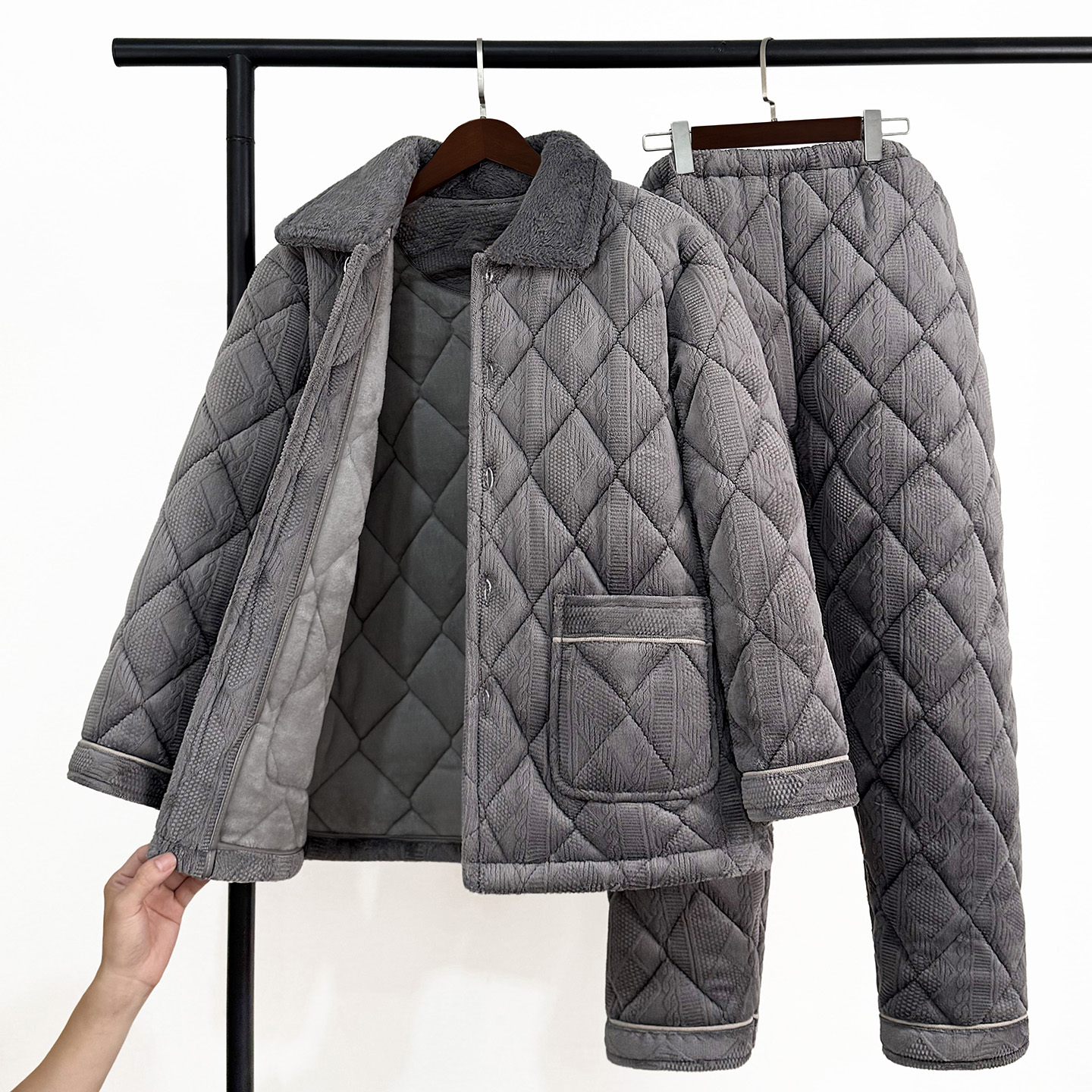 睡衣男士冬季加厚加绒爸爸三层棉袄珊瑚绒保暖中老年人家居服套装