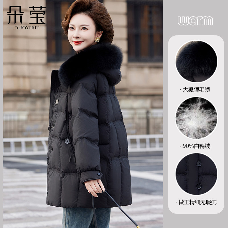 鸭鸭中年妈妈装羽绒服女冬季连帽90绒实用口袋加倍保暖中长款外套