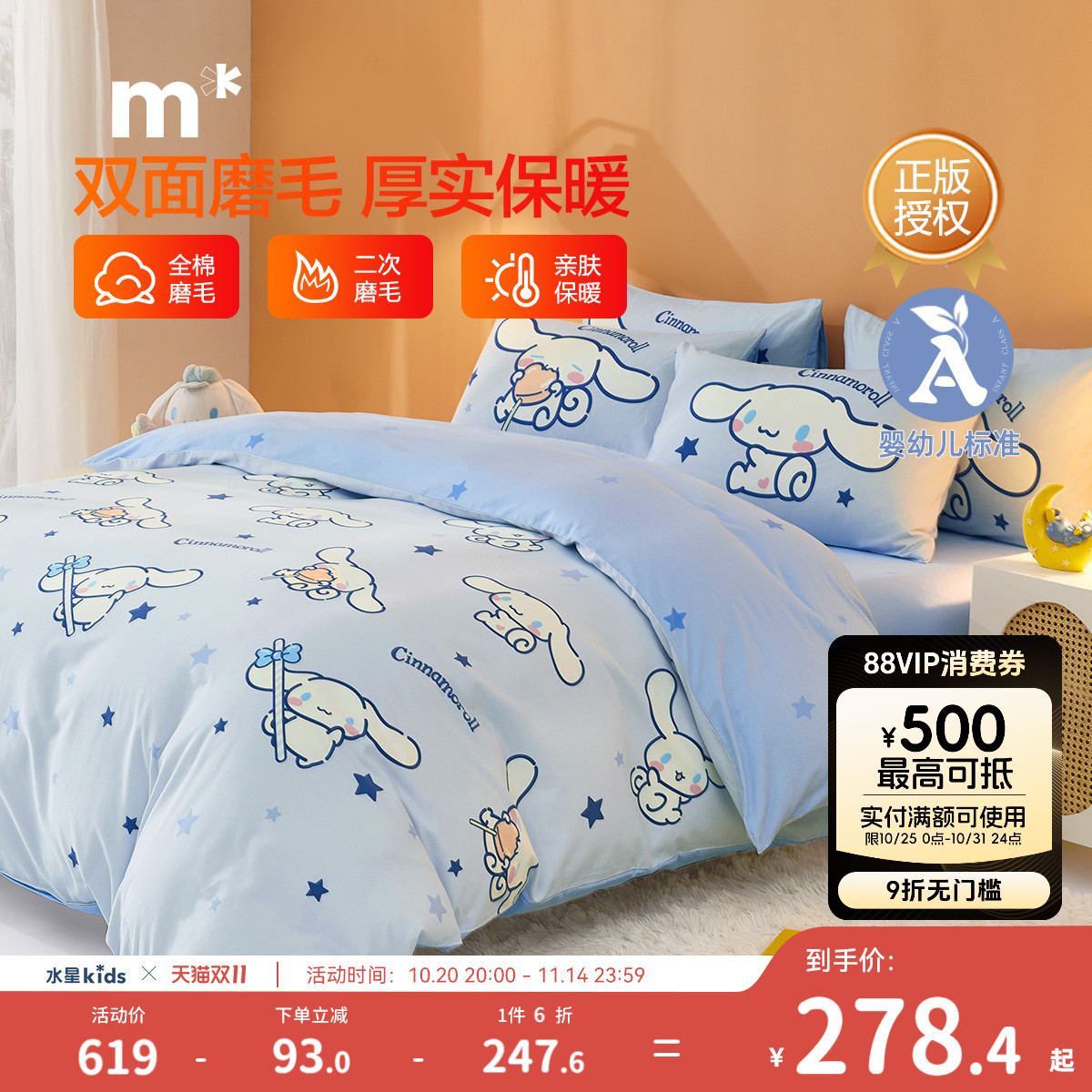水星家纺全棉儿童卡通磨毛四件套纯棉男加厚保暖床单被套床上用品
