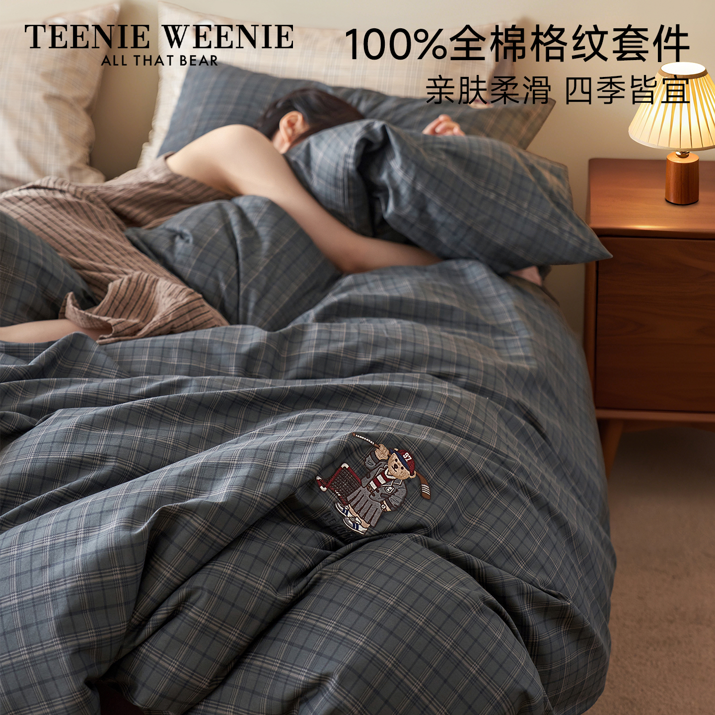 TeenieWeenie北欧风全棉纯棉四件套男深蓝色格子被套学生宿舍套件