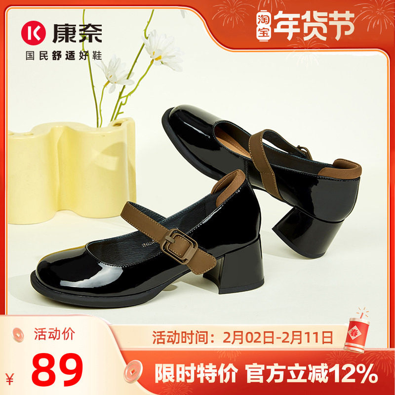 真皮~复古粗跟山茶花单鞋女2026新款一字扣通勤棕色玛丽珍高跟鞋