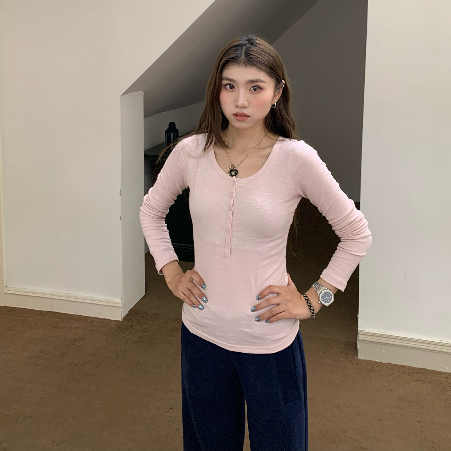 橘子树在哪儿韩系亨利领长袖t恤女秋季纯欲风收腰显瘦内搭打底衫