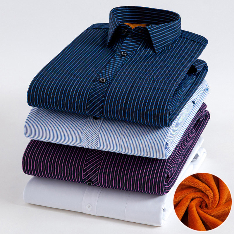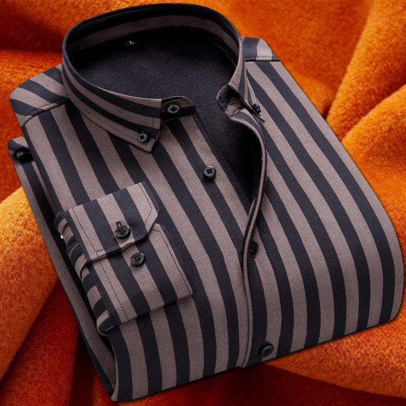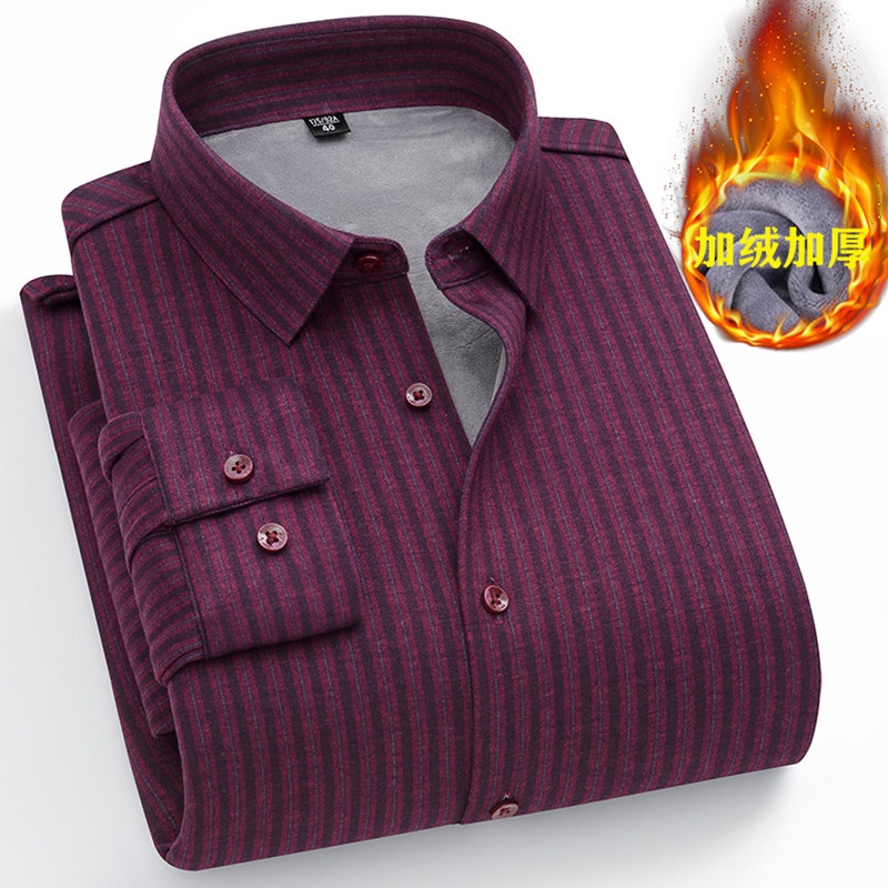 冬季男士保暖衬衫加绒加厚长袖条纹衬衣中年休闲父亲爸爸装打底衫
