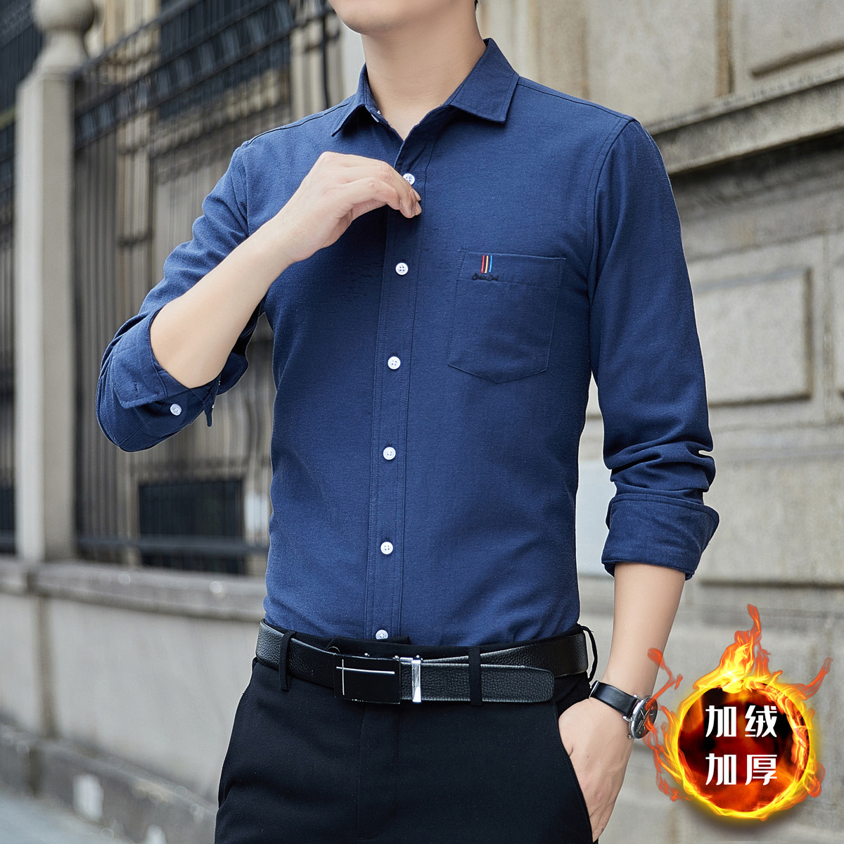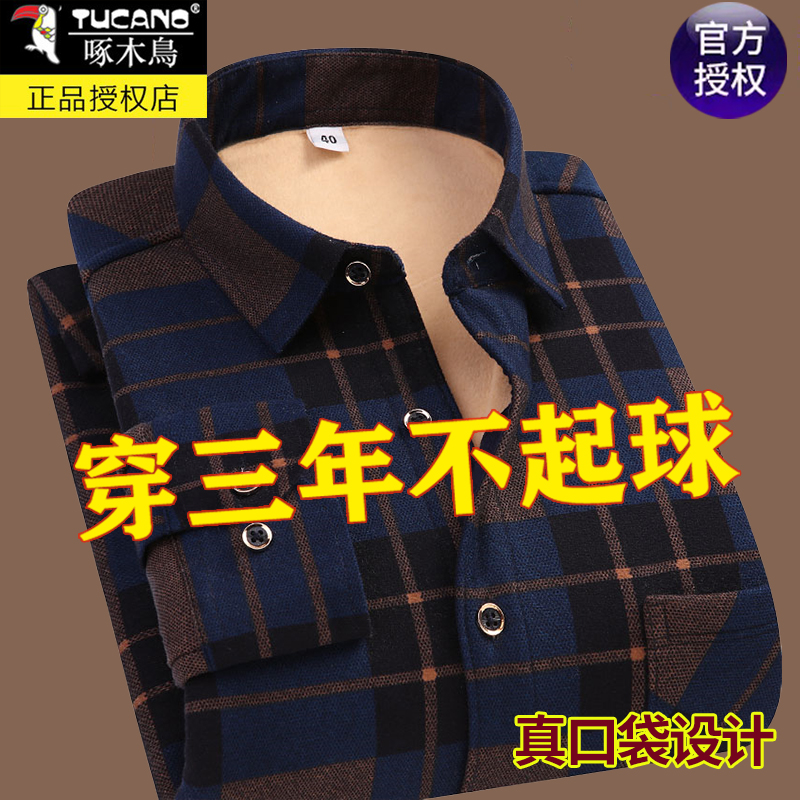 啄木鸟冬季加绒加厚衬衫男长袖中老年父亲秋装内搭免熨烫保暖衬衣