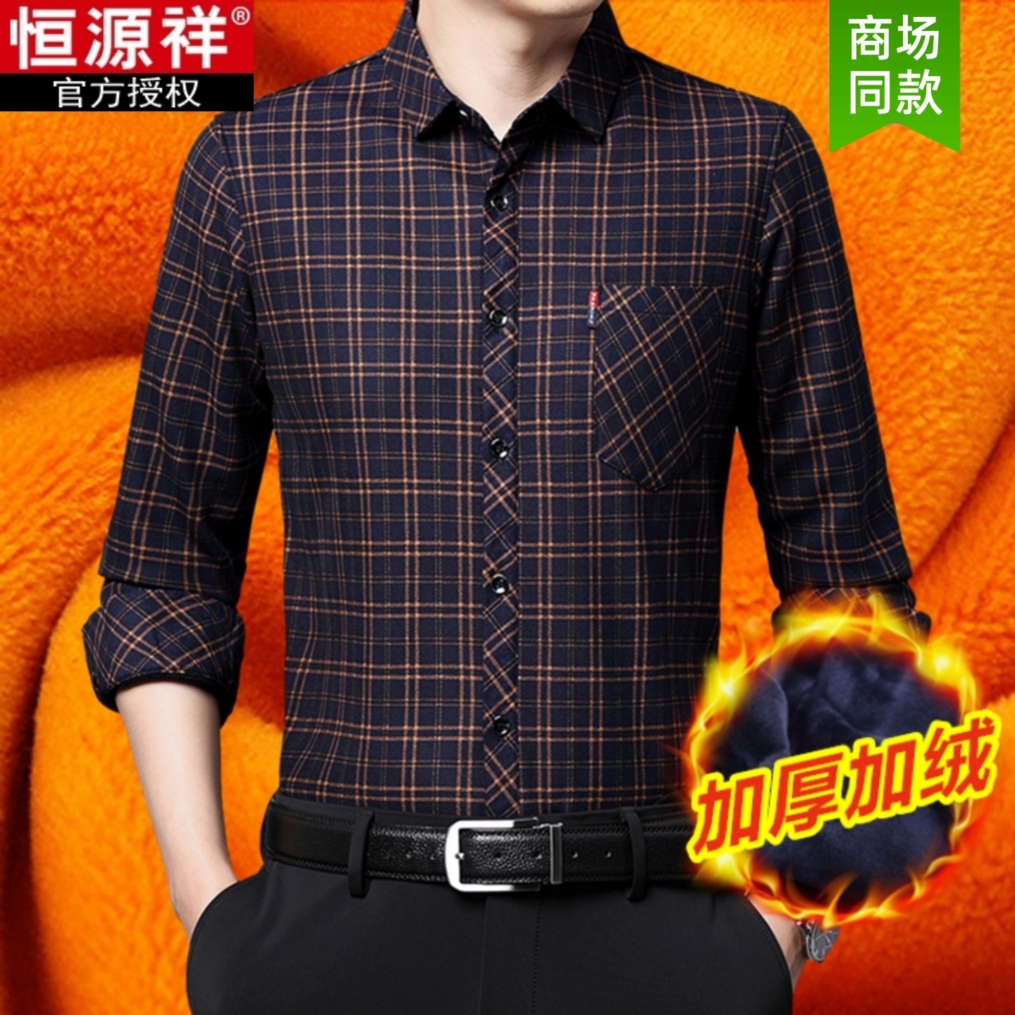 恒源祥加绒保暖衬衫男中年高端纯棉宽松格子衬衣父亲冬装加厚上衣