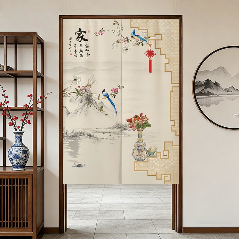 中式山水花鸟门帘隔断帘卫生间短帘厨房遮挡布艺帘家用半帘免打孔