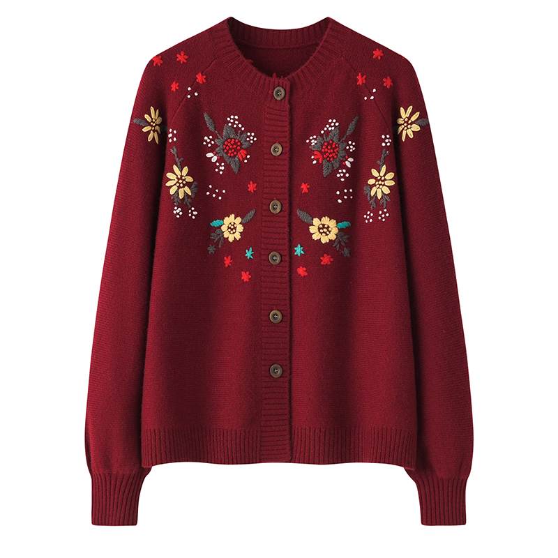 女士100纯羊绒衫圆领加厚刺绣提花甜美宽松针织对襟开衫秋冬新品