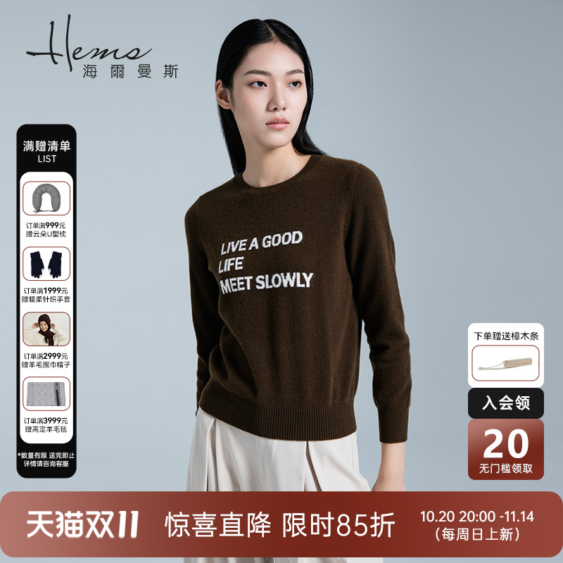 【门店同款】海尔曼斯长袖纯羊绒衫圆领提花时尚女上衣复古慵懒风