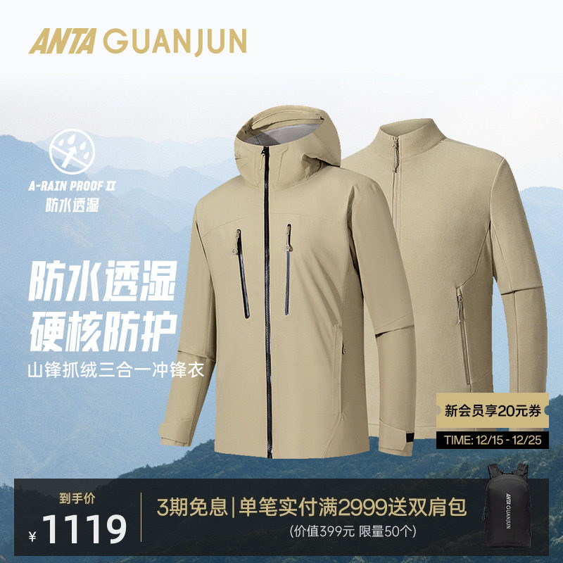【山锋】安踏冠军抓绒三合一冲锋衣冬季户外梭织两件套152540614