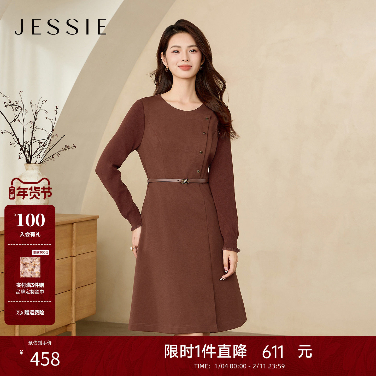 JESSIE美拉德风棕色圆领连衣裙女秋冬新款中长款打底内搭裙子