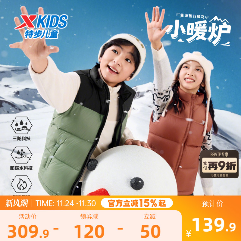 特步童装秋冬新款儿童外套男童保暖羽绒马甲中大童防寒服外穿冬装