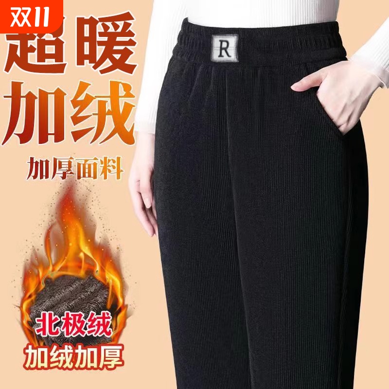 秋冬季加绒加厚宽松大码中年妈妈保暖裤灯芯绒休闲高腰外穿直筒裤