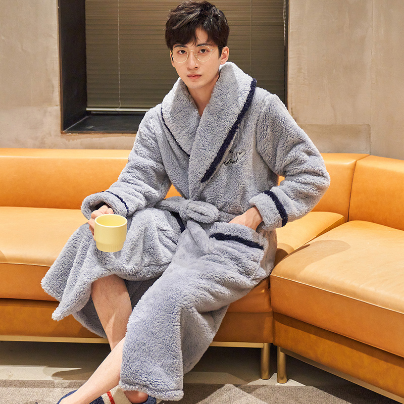 珊瑚绒冬季男士浴袍加厚休闲简约长款睡袍男家居服法兰绒睡衣男冬