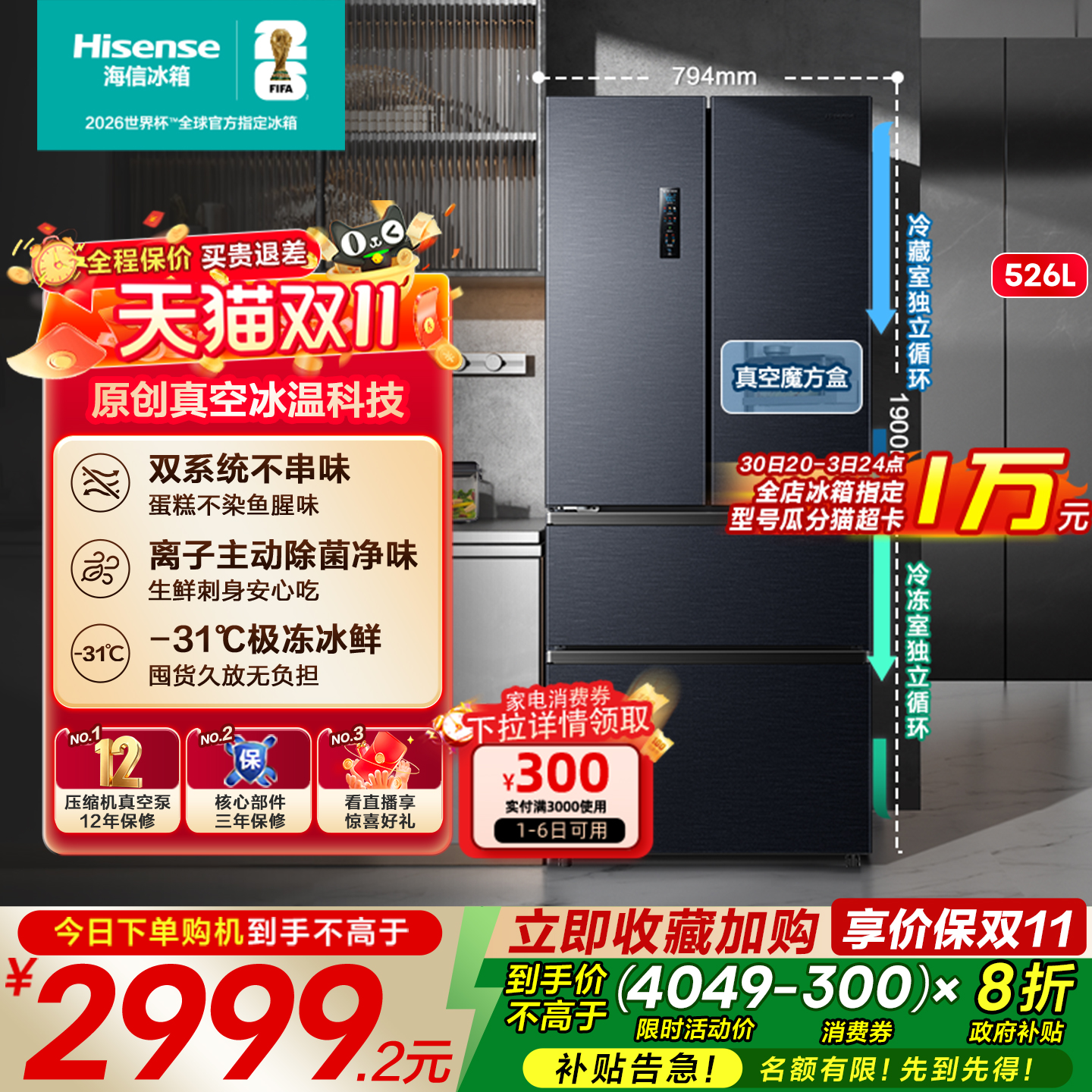 海信小榴莲526冰箱真空保鲜四门法式冰箱双系统家用一级换新补贴