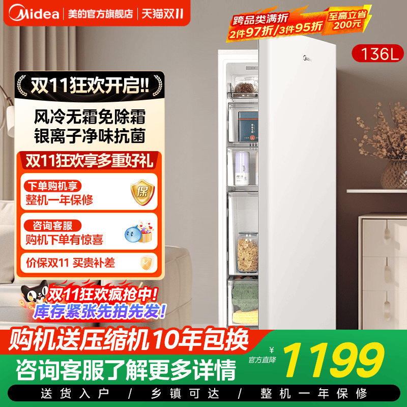 美的136L立式冰柜家用全冷冻抽屉冷柜风冷无霜母乳一级节能小冰箱