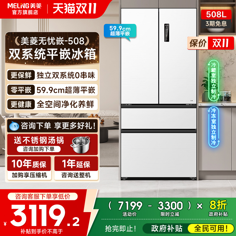 美菱无忧嵌508L法式冰箱双系统零嵌入式超薄家用一级能效换新补贴