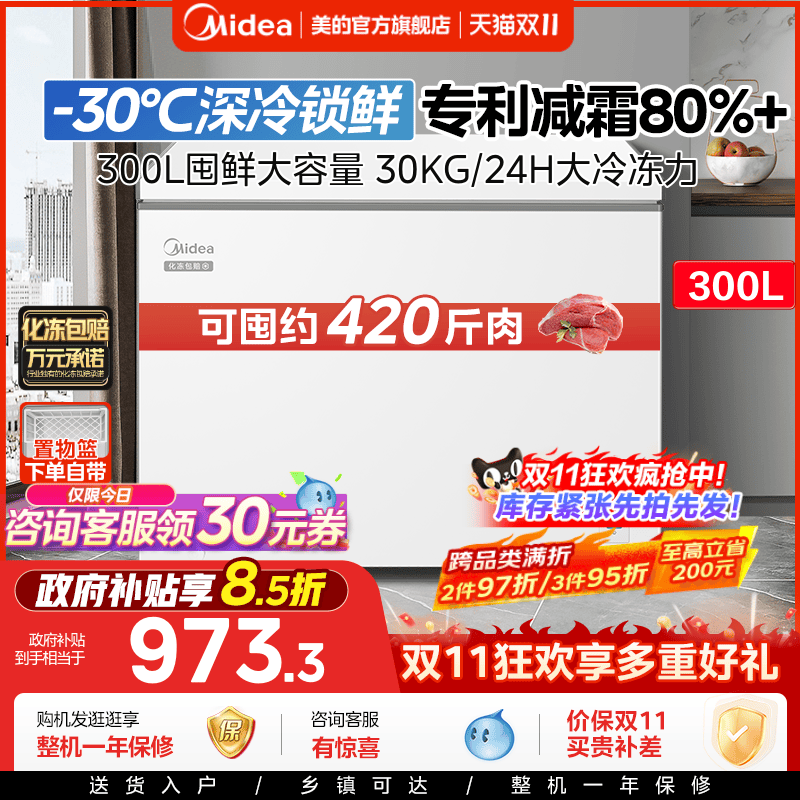 美的300L冰柜家用大容量冷柜商用冷冻柜冷藏两用一级节能官方冰箱