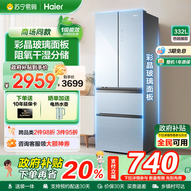 海尔冰箱 家用332L升法式多门四开门风冷无霜一级能效官方旗舰497