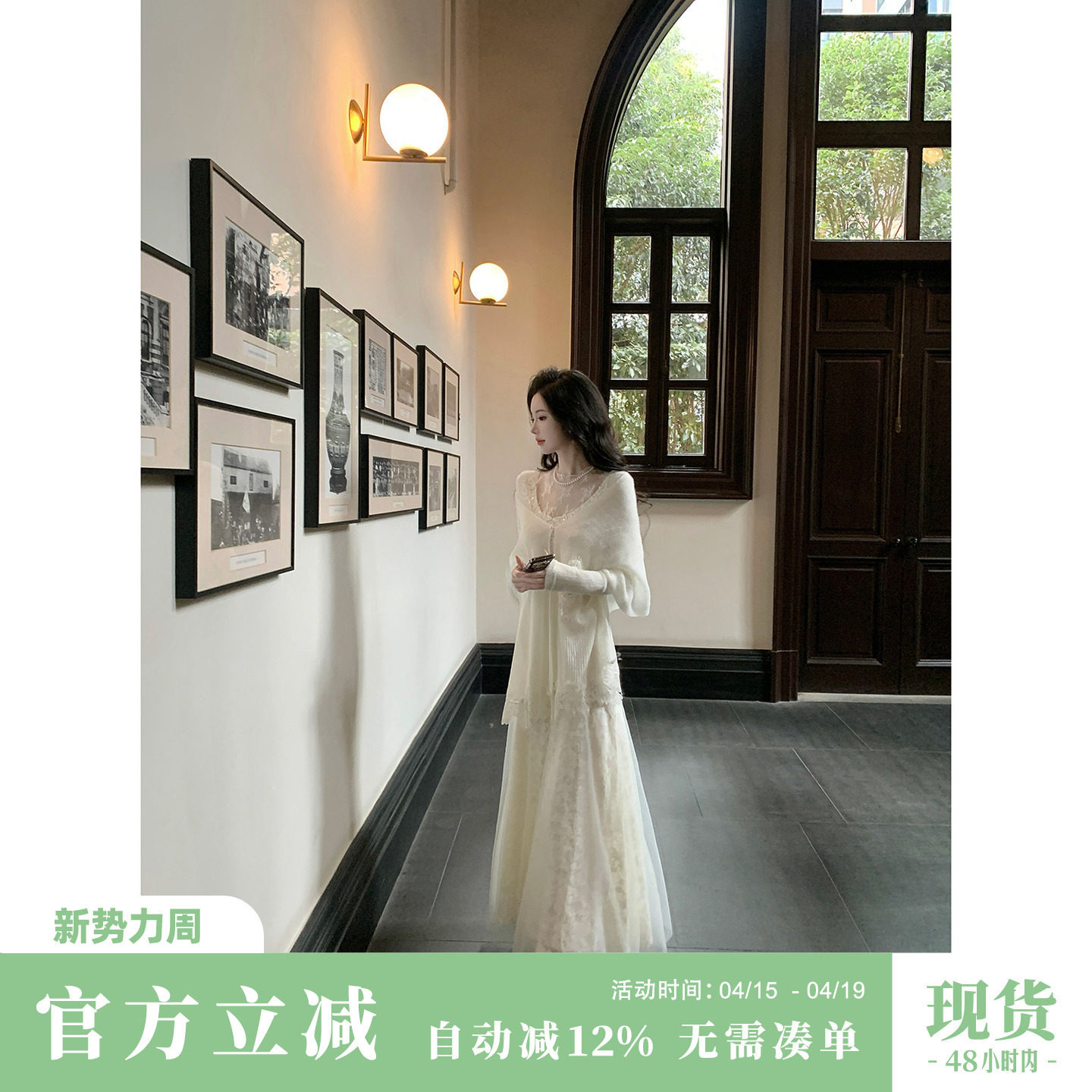 Sun雅乔【月下伊人】春秋新款清冷感针织网纱蕾丝拼接长袖连衣裙