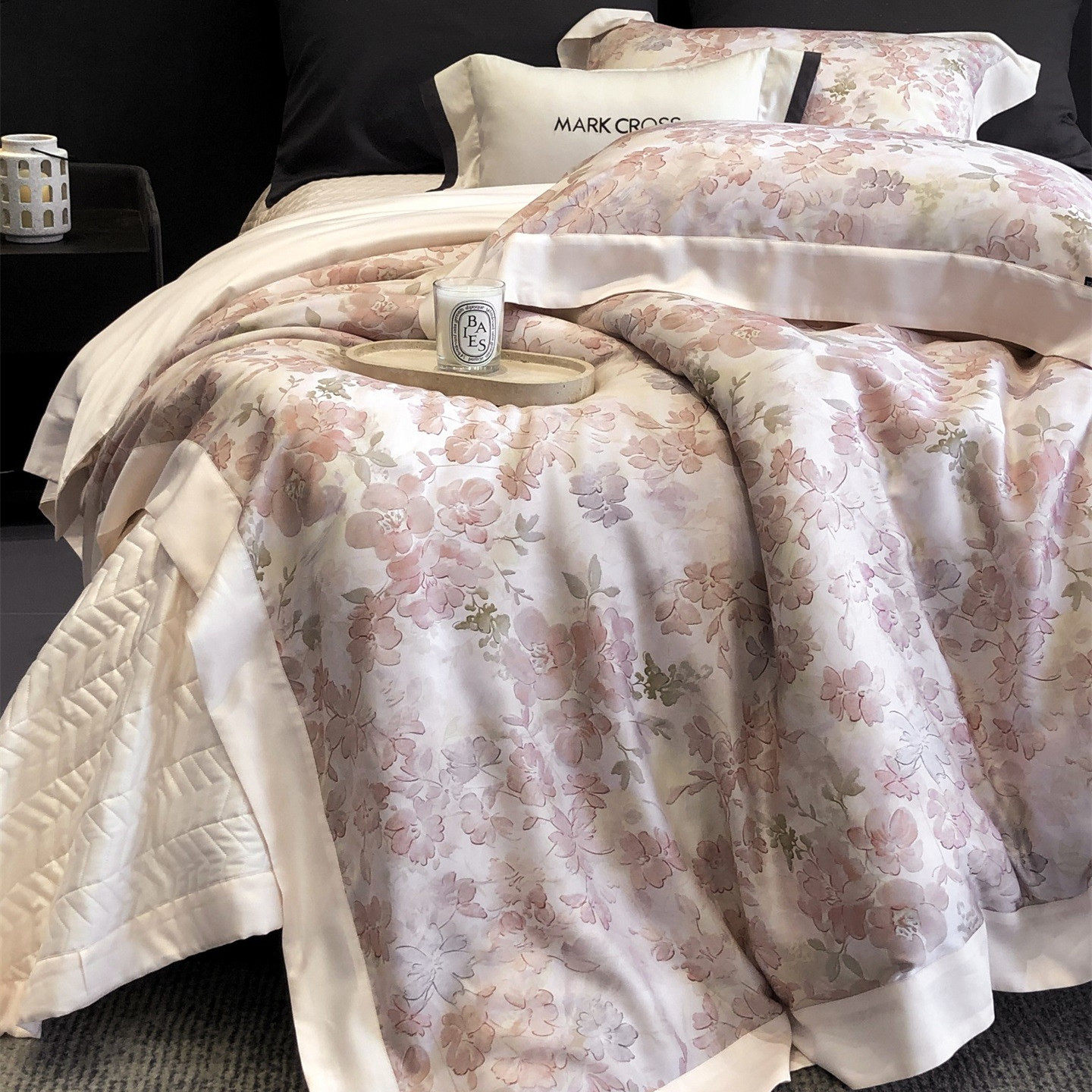 厂家直发【樱花风铃】奶基米印花床盖四件套莱赛尔纯天丝磨毛床品