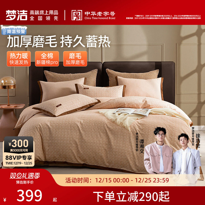 梦洁家纺全棉磨毛床品四件套纯棉全棉秋冬季轻奢高端床单被套加厚