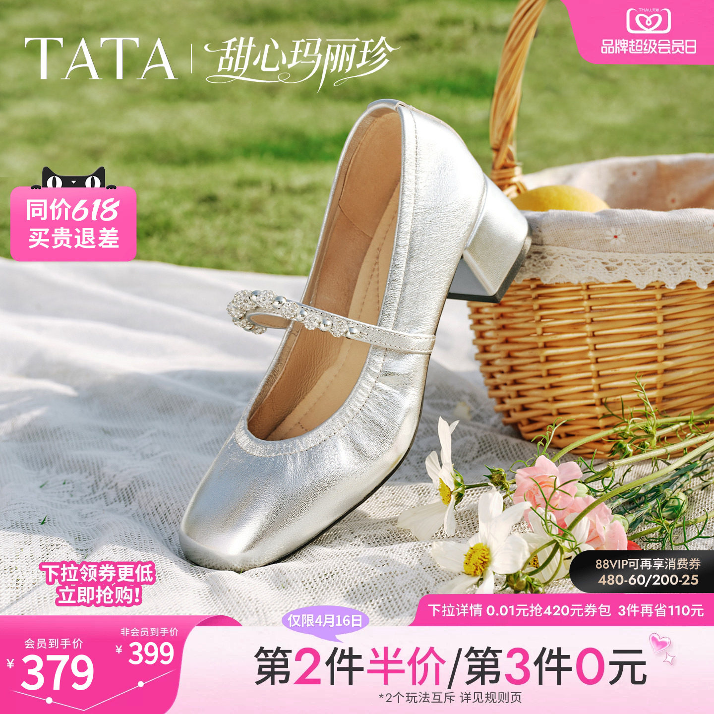 TATA他她甜心粗跟玛丽珍鞋女显高银色小皮鞋休闲女鞋舒适真皮单鞋