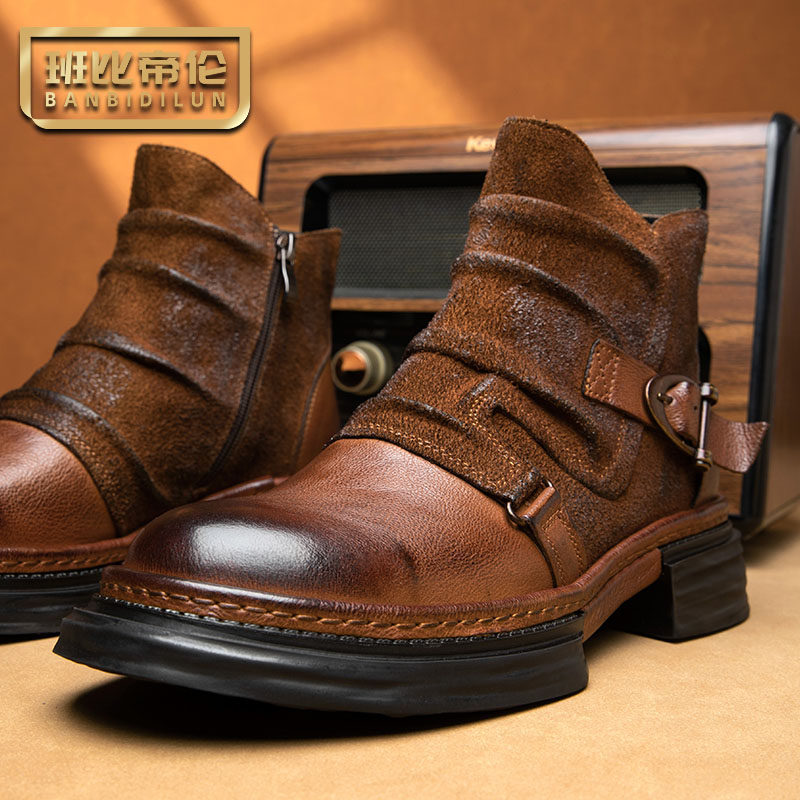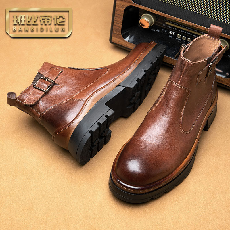 英伦复古马丁靴男真皮手工拉链增高厚底切尔西靴男款牛皮机车短靴