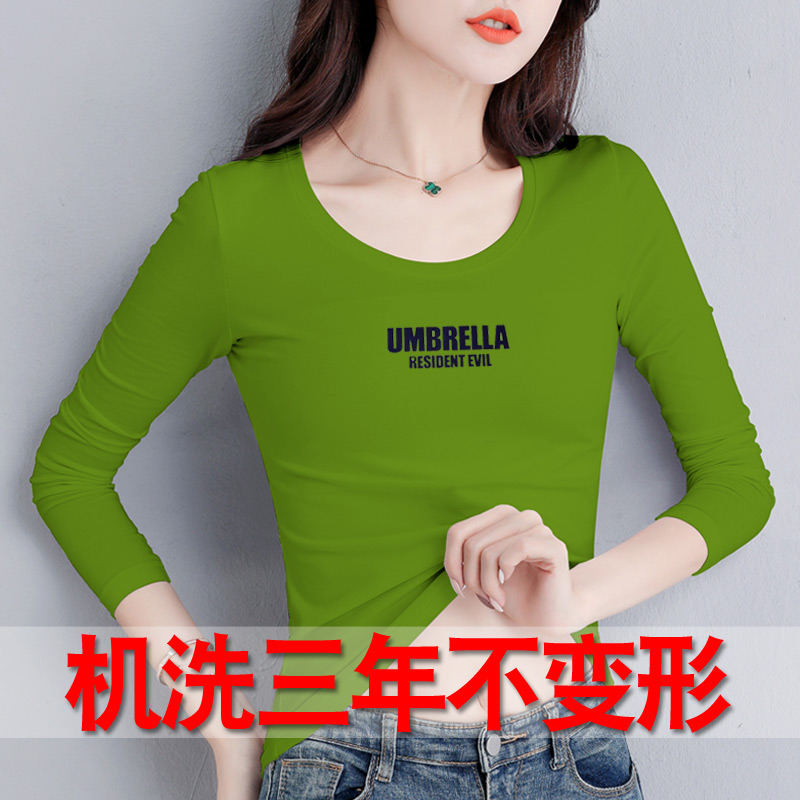大圆领t恤女长袖早秋新款修身显瘦内搭打底衫正肩纯棉紧身上衣薄