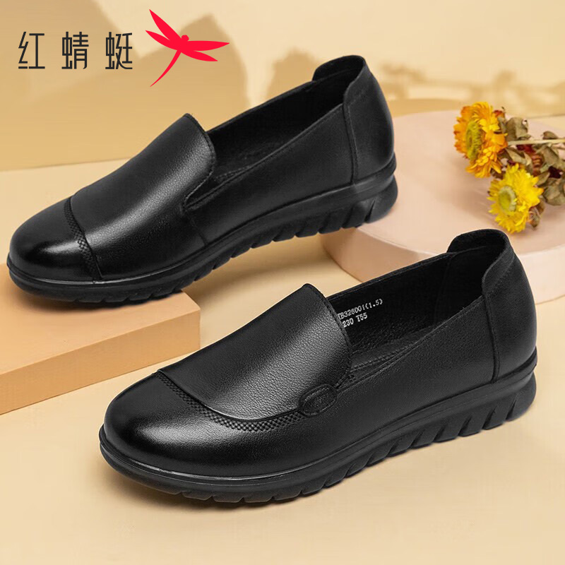 红蜻蜓女鞋秋季中老年妈妈鞋真皮浅口平跟小皮鞋软底女士休闲单鞋